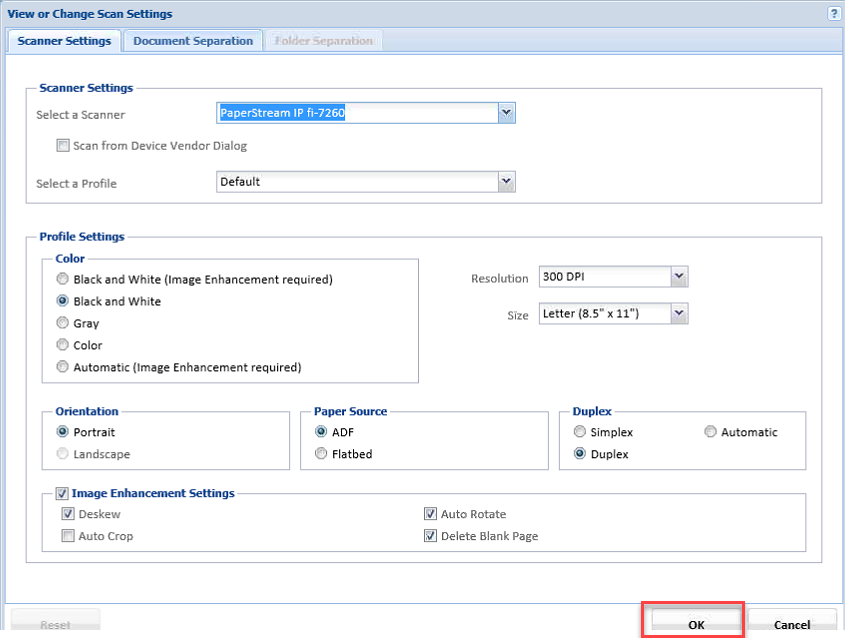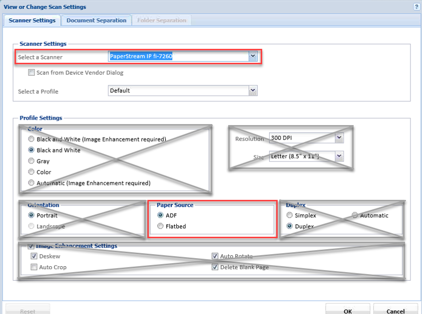 The standard scan settings should only need to be changed to import a file instead of scanning, or to scan from the flat bed instead of the Automatic Document Feeder (ADF).