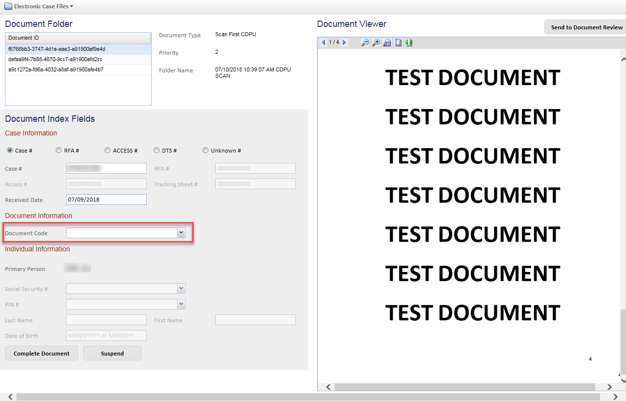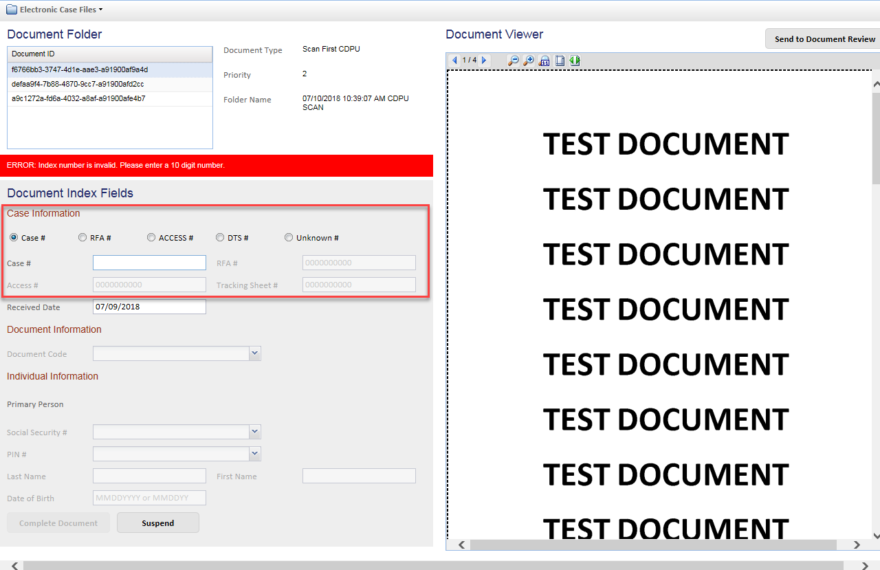 Enter the related case number, RFA number, ACCESS number, or select Unknown If a Document Tracking Sheet (DTS) was used to scan the document, the DTS and related case or ACCESS number will automatically populate. If the document type is Process First CDPU, Process First CDPU Priority 6, Process First Local, or Process First OIG only a case number may be entered. |