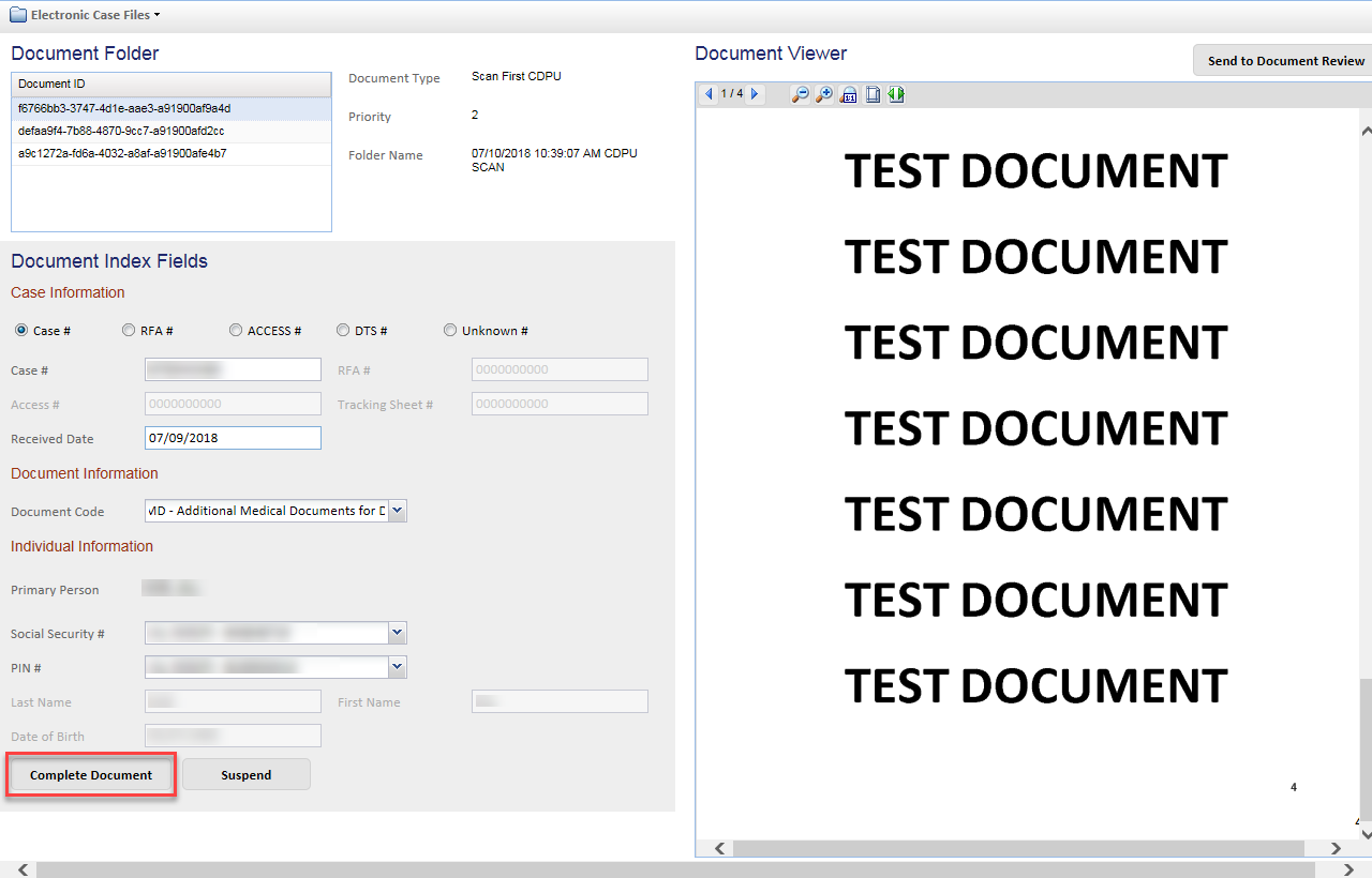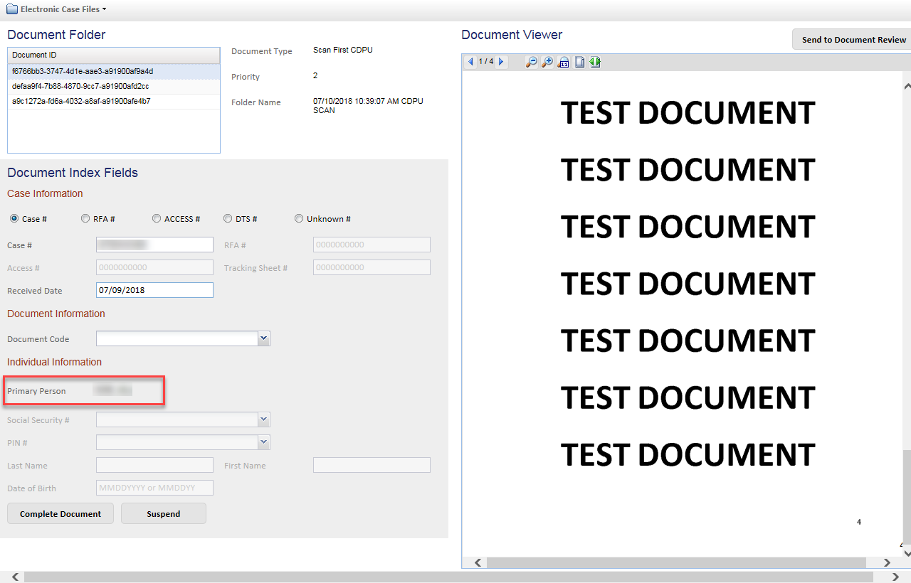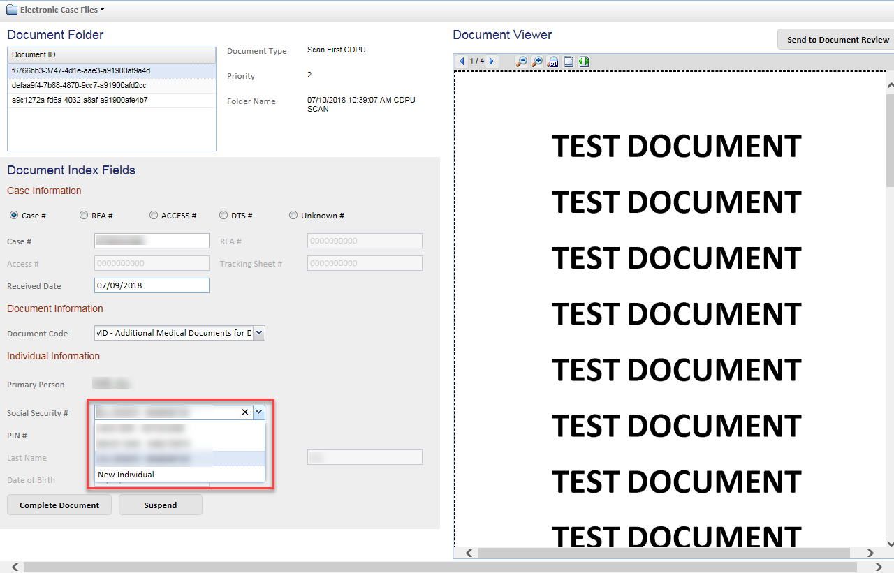 Use the Social Security # or PIN # drop-down list to select an individual associated with the case. Last Name, First Name, and Date of Birth are automatically populated with information from CWW. If the person is not listed, select New Individual in the drop-down list. Then manually enter the the following (if it is available in the document): o Social Security # o PIN # o Last Name o First Name o Date of Birth |