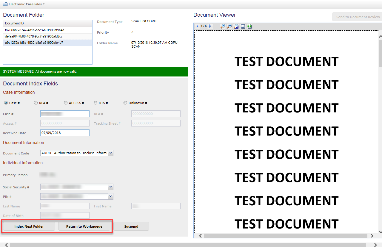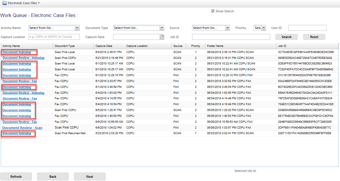 | From the Work Queue page, click on a folder with the Activity Name of Document Index. | Click image for larger view